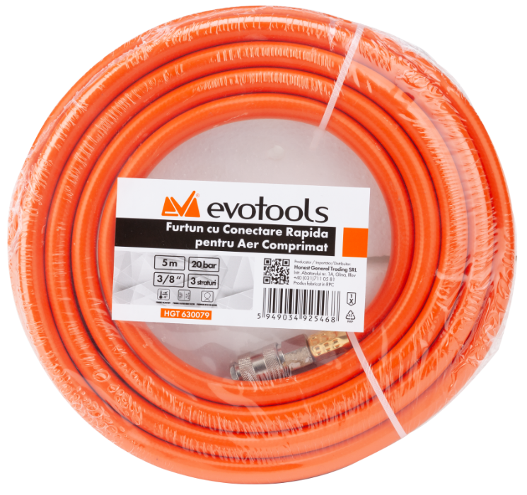 Pressure hose for compressors or spray guns Connection: quick couplings M/F Maximum working pressure: 20 bar (300 PSI) Air fitting diameter: 3/8"