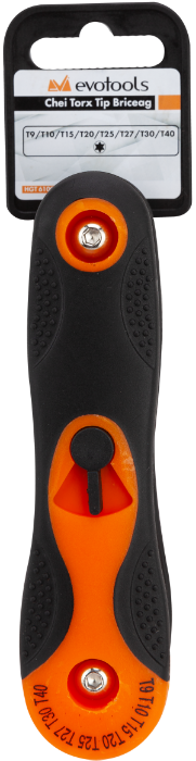 This EvoTools® set has a body made of polypropylene and thermoplastic rubber (TPR), and the Torx keys are made of heat-treated carbon steel. On the side there is a locking button so you can safely use one of the 8 keys. The set contains keys in the following sizes: T9, T10, T15, T20, T25, T27, T30 and T40. Thanks to its compact size, it is very useful and can be easily stored in a clothing pocket.