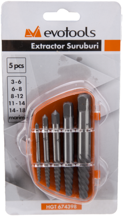 This EvoTools® set contains extractors made of top-quality, heat-treated steel. It is ideal for removing broken or seized screws. The 5 pieces are stored in a polypropylene box. They can be used for screws sized 3-6 mm, 6-8 mm, 8-12 mm, 11-14 mm and 14-18 mm.