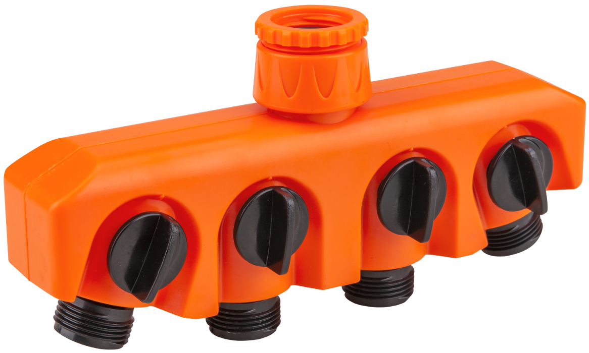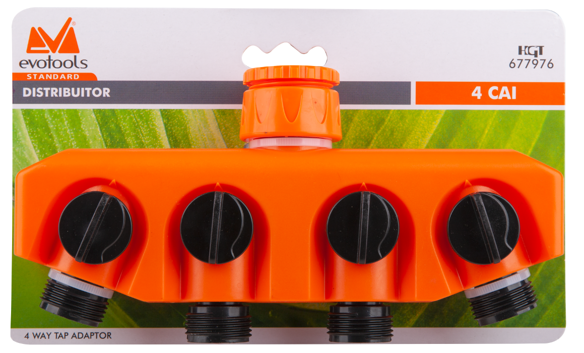 The EvoTools® distributor is made of ABS, allowing connection of 4 hoses with a 3/4" diameter, supplied via a 3/4" - 1" adapter connector. Each outlet has a mini valve to open or close it, so they can operate independently. This distributor is ideal for irrigation installations.